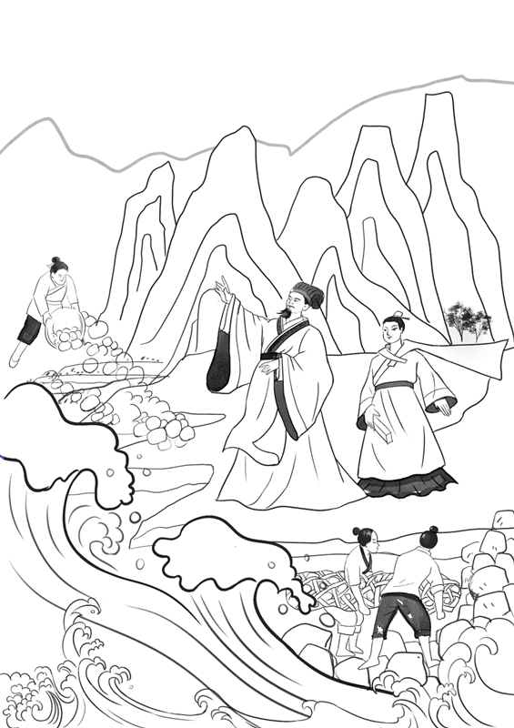 李冰帶上兒子李二郎,他們實地勘測山勢、水勢,風餐露宿走訪了許多地方,歷經(jīng)數(shù)月,終于抵達岷江源頭,又帶回大量珍貴的水文資料。之后,李冰廢寢忘食,總結前人治水的經(jīng)驗,提出“分洪以減災,引水以灌田”的治水方針,決定率領民眾在岷江上修建一座防洪、灌溉、航運兼用的大型綜合水利工程——都江堰水利工程,使川西平原從此成為“滿目稻麥,水旱從人,不知饑饉”的天府之國。