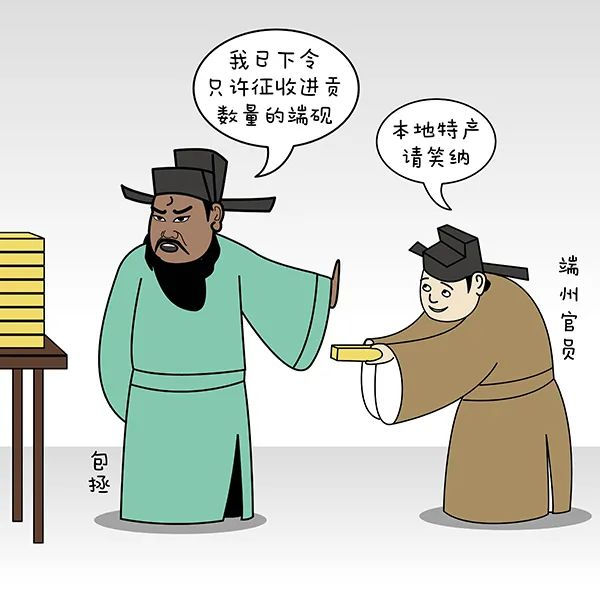 慶歷元年(1041年),包拯南下嶺南出任端州知府。端州自古以來以其端硯聞名于天下,為四大名硯之一,而當(dāng)時(shí)端州官場潛規(guī)則很盛,以給朝廷進(jìn)貢的名義征收數(shù)十倍的端硯來“孝敬”上級(jí)官員,以求來日上頭有人好做官。包拯到來,一心只為減輕百姓負(fù)擔(dān),下令只許征收進(jìn)貢數(shù)量的端硯,禁止多征一個(gè),自斷歷來這條“升官捷徑”機(jī)會(huì)。包拯以身作則,任職3年,兩袖清風(fēng),“歲滿不持一硯歸”。